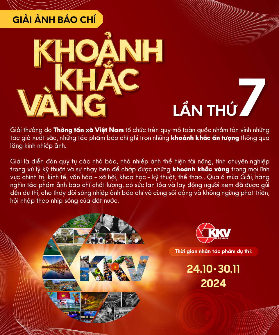 Thể lệ KHOẢNH KHẮC VÀNG lần thứ 7 (KKV7) là Giải ảnh báo chí do Thông tấn xã Việt Nam tổ chức trên quy mô toàn quốc. Giải thưởng tôn vinh những tác giả xuất sắc, những tác phẩm báo chí ghi trọn những khoảnh khắc ấn tượng thông qua lăng kính nhiếp ảnh. Giải được phát động từ tháng 24/10/2024 đến ngày 30/11/2024. Chi tiết thể lệ >>